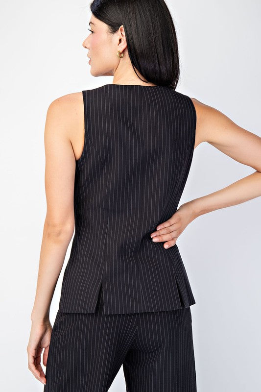 Chaleco disponible en color beige y negro con contraste blanco, su diseño es elegante y moderno. Tiene cuello cuadrado y botones al frente que lo hace aún más sofisticado. Su interior forrado proporciona comodidad durante todo el día. Perfecto para un look profesional o casual, este chaleco hace juego a la perfección con nuestro pantalón a raya, creando un conjunto estilizado y en tendencia.